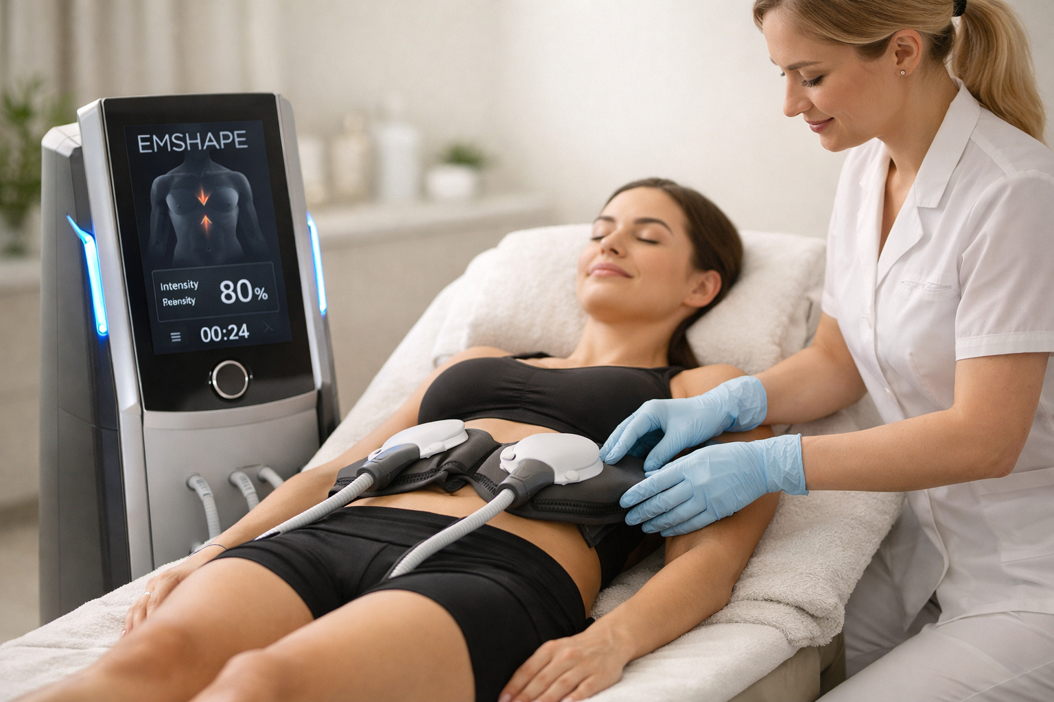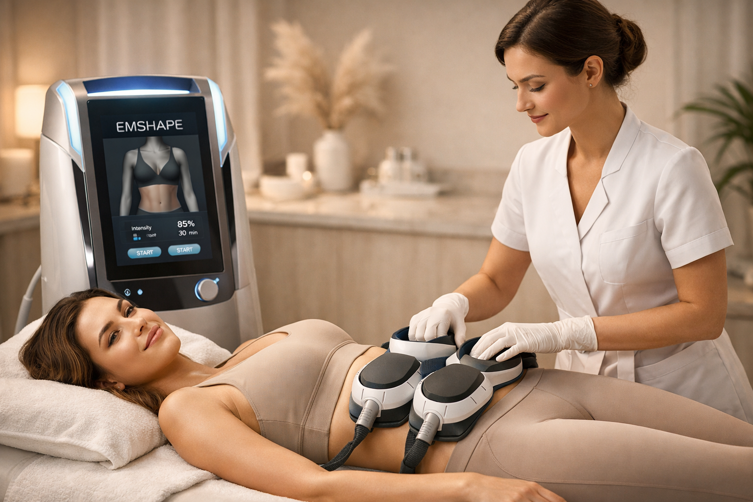 EMShape uses electromagnetic energy to tone muscles and burn fat.